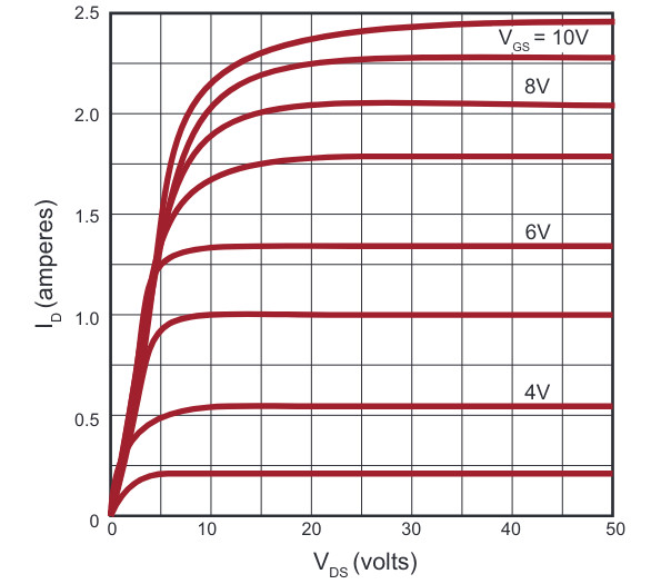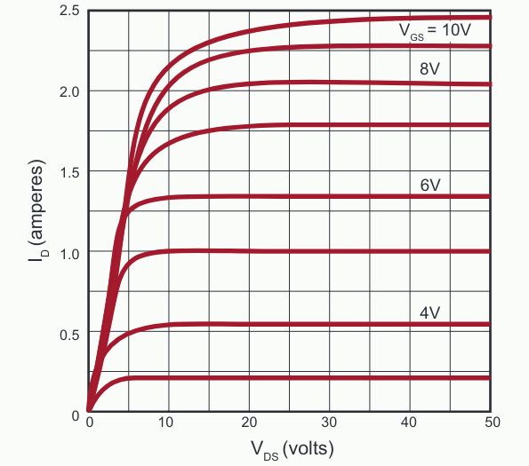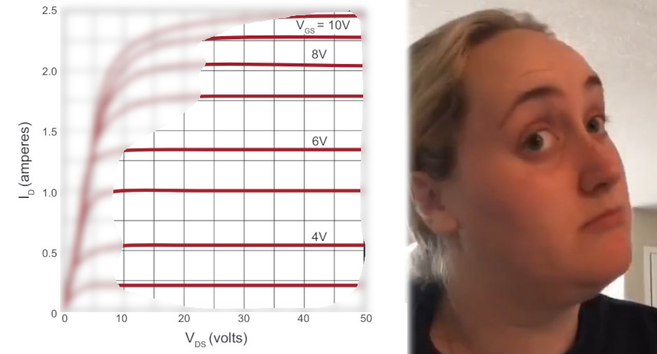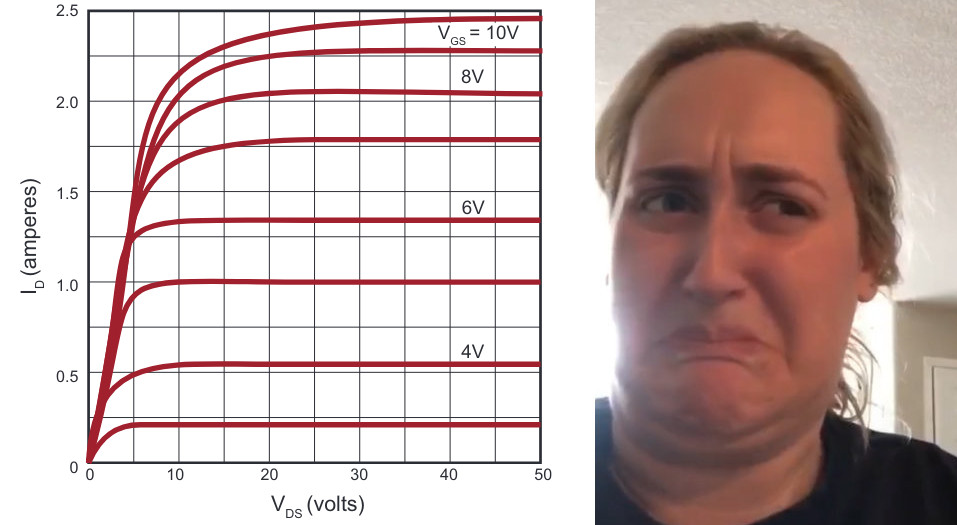 On page 4 of the datasheet there are also some interesting curves shown, which help us characterize the behavior of this device. But oh, no! The curves are all horribly nonlinear and gross, for example, here's the one we're really going to be caring about today, which shows how the voltage drop between the Gate terminal and the Source terminal (v_{\rm gs}) and the voltage drop between the Drain and the Source (v_{\rm ds}) relate to the current flowing from the Drain terminal to the Source terminal (i_{\rm d}):