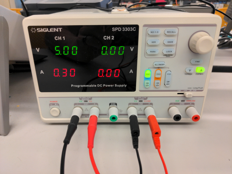 - Click the "CH1" button if it's not already lit up, and then use the "V" and "A" buttons and the knob to set it to output 5Volts with a current limit of 300mA (0.3 A).