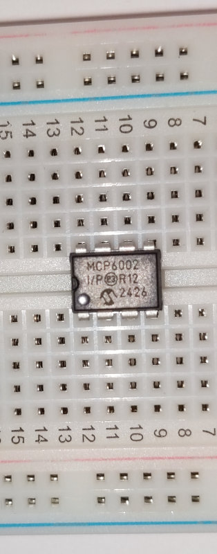We're going to be using some op-amps today, but we're going to use a different package than before. We used the L272 op-amps when powering the motors because those op-amps were designed to be able to source a lot of current (which the motors needed in order to spin). For today, though, we don't particularly need a lot of current; rather, we need op-amps that can respond really quickly to their inputs. As such, we'll use a different op-amp: an MCP6002. Like the L272's, there are two op-amps in each MCP6002 package; but be really careful, because this chip has a different pin layout than the L272's do. The pinout for the MCP6002s is shown here (and clicking it will open a copy in a new tab):
