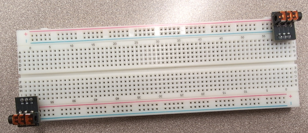 Now that we have an audio signal, let's go ahead and listen to it! Plug your other TRS connector into the breadboard. On this one: