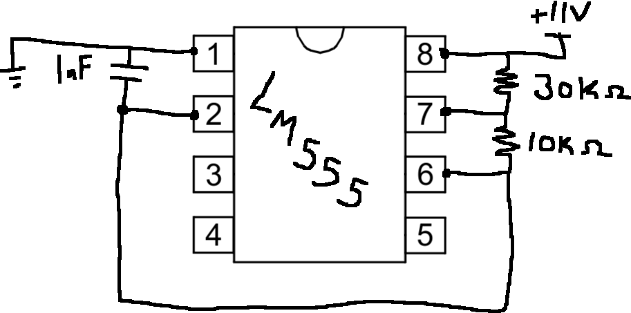- We should have a 10{\rm k}\Omega resistor between pins 6 and 7.