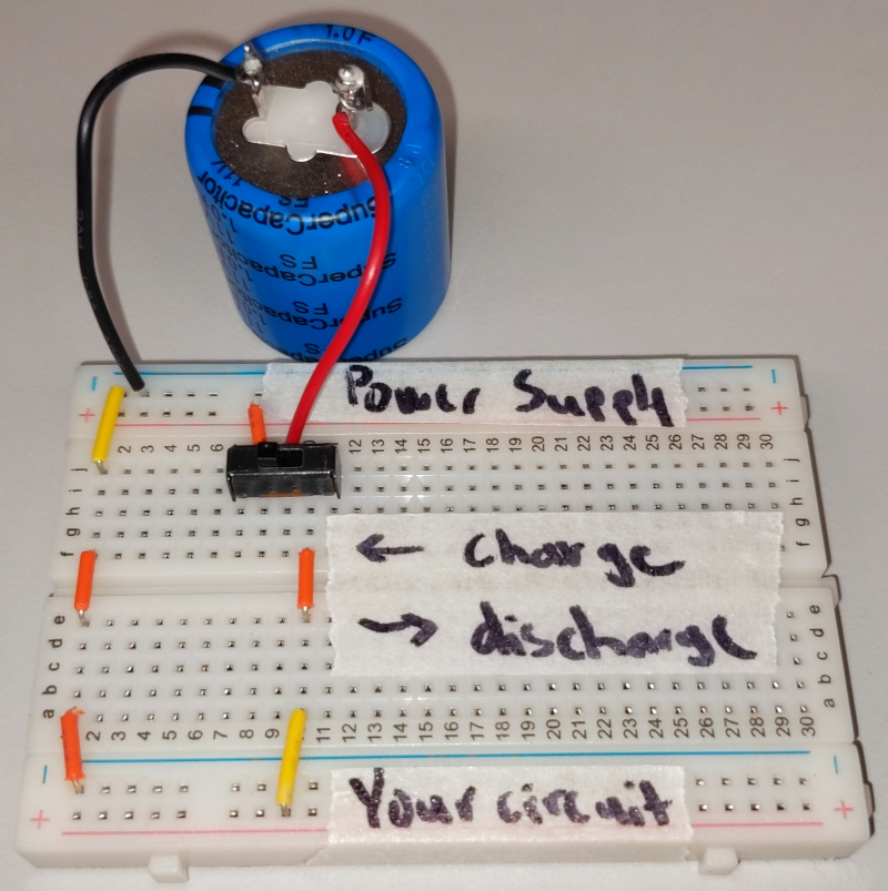 So why do we care about efficiency? Well, one place we care is when we're powering a device from a battery; in short, a more efficient power converter means longer battery life! In this section, we'll put that idea to the test a little bit, using supercapacitors as little rechargable 11V batteries.