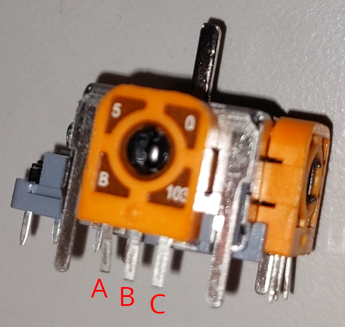 Go ahead and grab a joystick from the tables at the front of the room. They look like this, where the two little orange thingies on the sides are the potentiometers. Each pot has three terminals, which are connected like so: