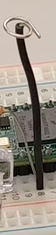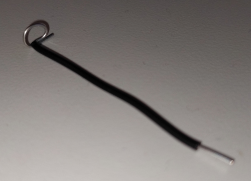 To start, remove the capacitor from your board. Then make a little loop of wire like the following (cut off a length of wire, strip the two ends, and then make a couple of loops on one side), which will act as our touch sensor: