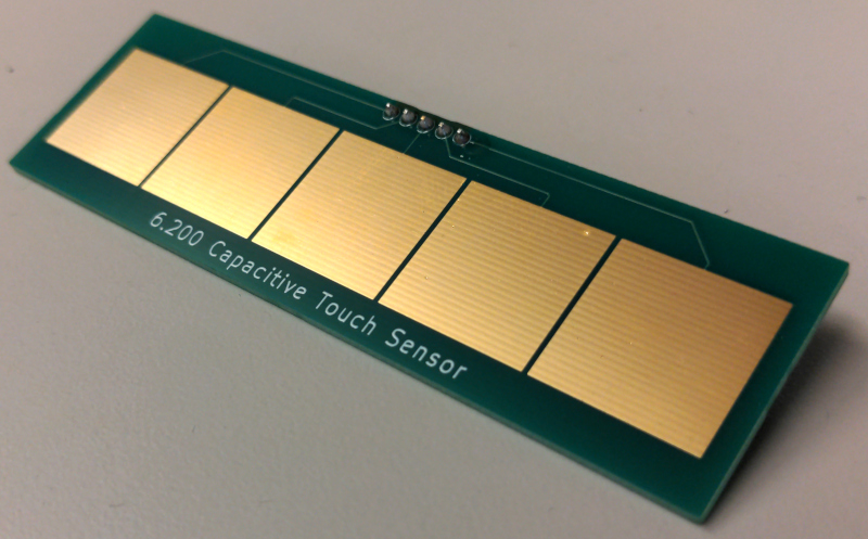 We'll finish today's lab with a toned-down version of the that same idea (the "self capacitance multi-pad" method described in that document, which is the same thing we just did with our little loop). We'll do a little 1-d spatial touch sensor using that principle. From the cart, grab yourself one of our little touch sensors, which just consists of a little PCB with 5 metal pads on it: