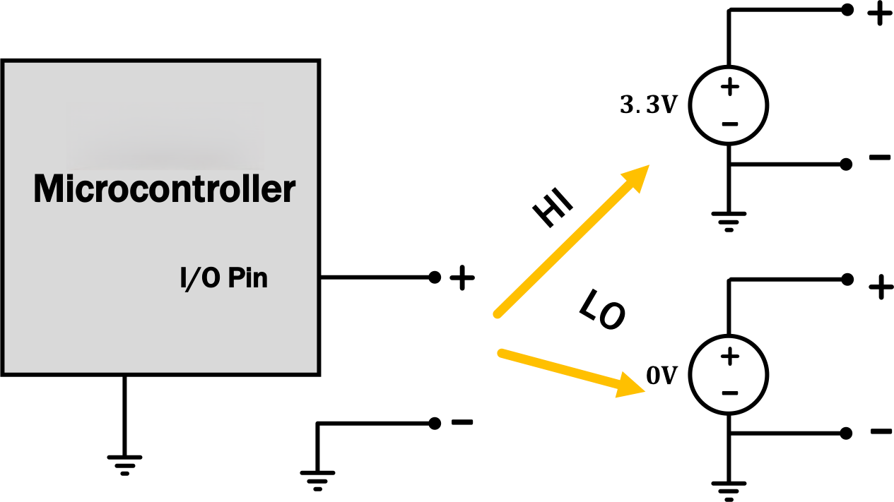 As mentioned in the prelab, this circuit is useful as a digital-to-analog converter (DAC, often pronounced like "dack"). We're going to hook it up to our RP2040, which is only capable of producing two voltages: a "high" voltage of 3.3 Volts and a "low" voltage of 0 Volts relative to its internal ground. Programmatically, we can set any pin to "high" or "low", making the corresponding pin look like this: