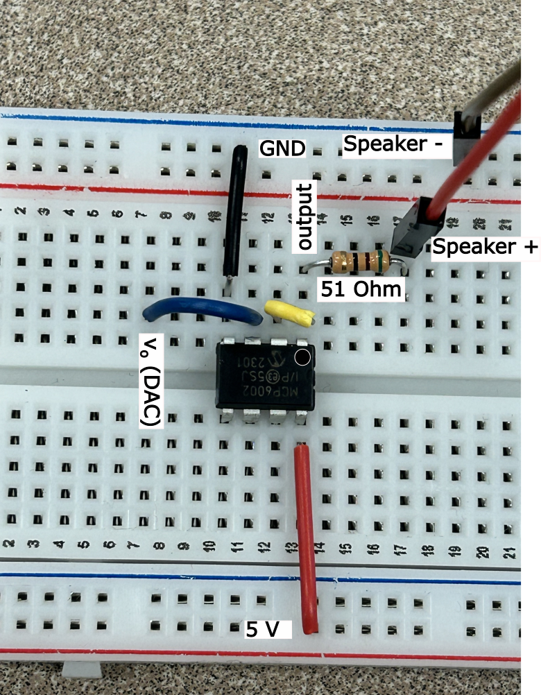 Lastly, our op amp can only provide about 30mA of current at the output. To make sure we don't exceed this current limit, we are going to add a 51 \Omega resistor in series with the speaker (higher total resistance means lower current at the same voltage).