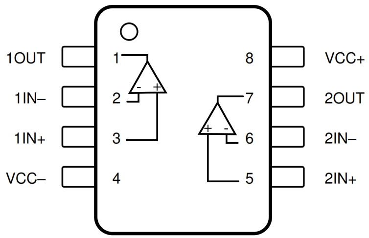 This package has two op-amps inside of it, so 1IN+, 1IN- and 1OUT correspond to one op amp. For this first example, we will only need to use one of the internal op amps. Make sure to take note of pin 1 (indicated by the dot on the package) and place your op amp across the middle of the board like we did in last week's lab.