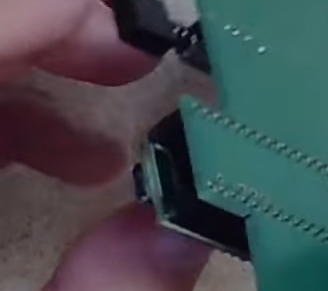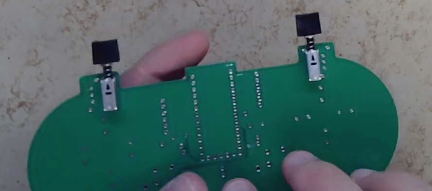 We'll actually start with the two that sit on the back of the board. Stick them into the board like so, putting the five pins of each through the five holes they fit into. Make sure the buttons themselves are on the side of the PCB with no text/logos on it (the pins should stick through the front side).