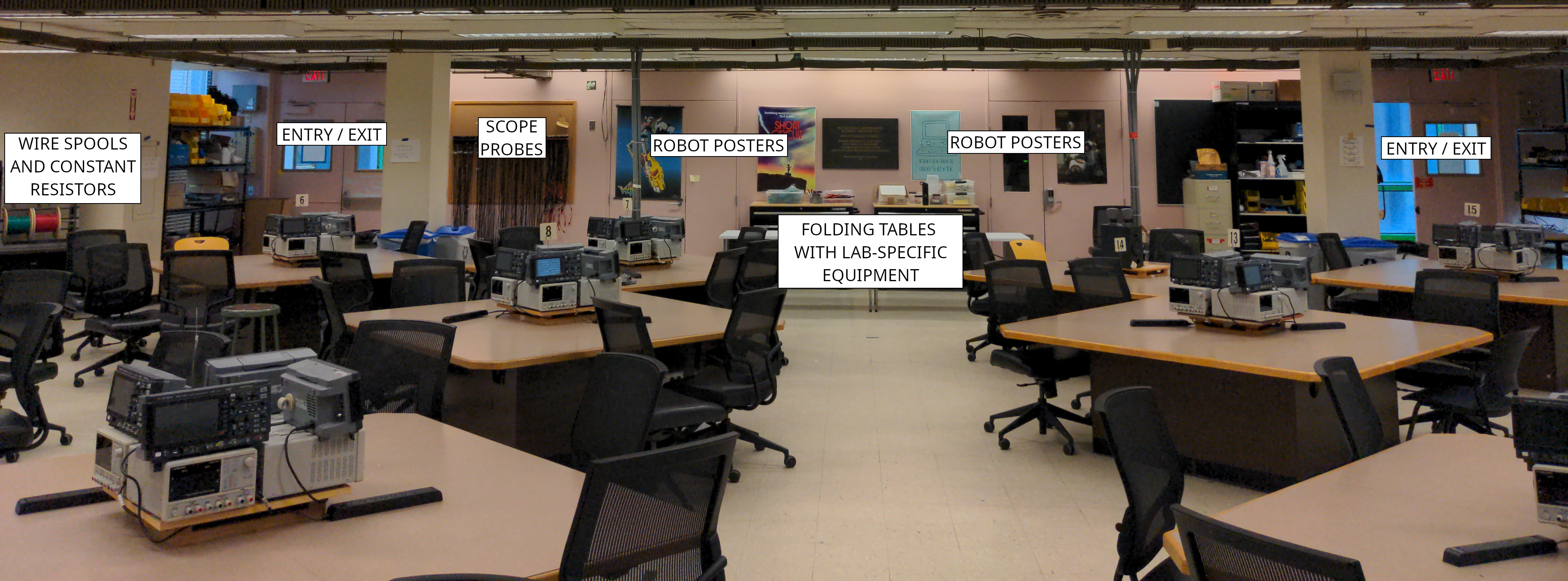 If your oscilloscope doesn't have any probes (or doesn't have enough probes) or a BNC-to-alligator connector, we have more up at the front of the lab space. See this little map or ask a staff member if you're having trouble finding them.