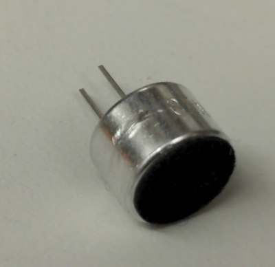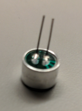 Let's also try using another cool circuit element whose properties change based on the physical environment in which it is placed: a microphone! The picture below shows the microphone we'll be using in today's lab from a couple of different angles. Note that it also has two terminals.