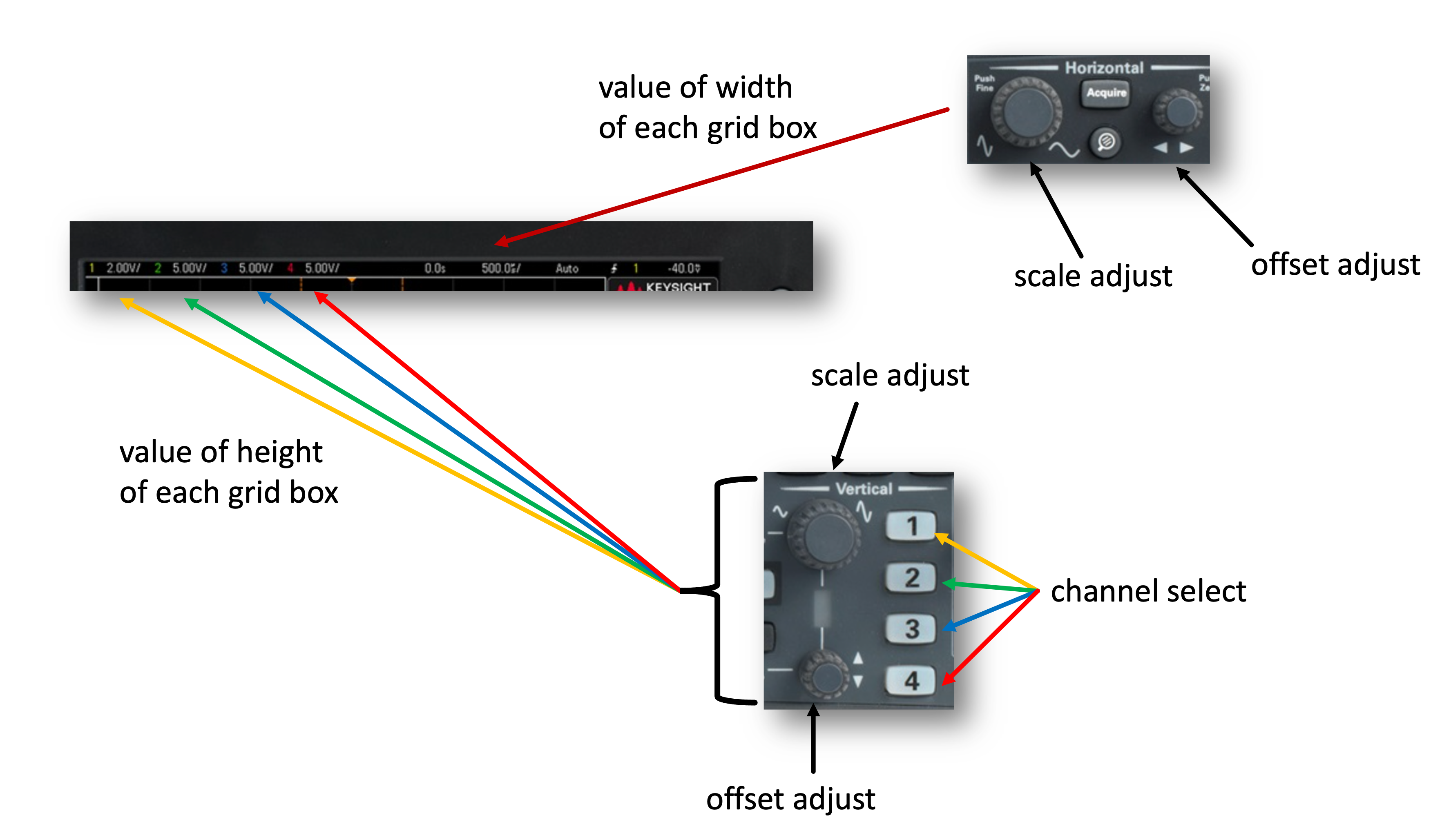 - This is also relevant for cursors; the measurements shown on the screen are tied to one channel's scaling; you can choose which channel you're measuring on the menu under 'Cursors' on the scope.