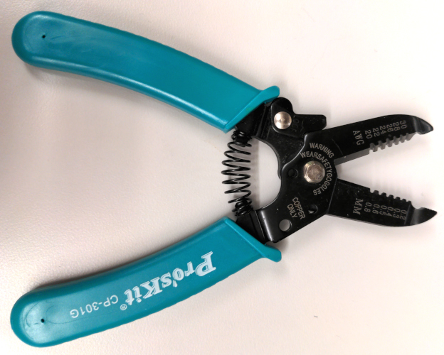 It has a sharp part (right near the hinge) that you can use to cut off a segment of wire. Then if you put the end of that wire into one of the holes near the top (the one labeled 24 AWG / 0.5mm is probably the right one), clamp down, and pull away, you can strip the plastic casing off the end of the wire.