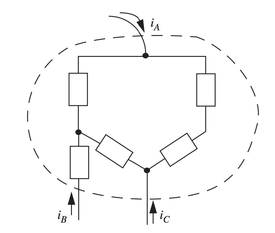 A sub-network, which is a portion of a larger network, is shown below. Only the three branch currents i_A, i_B and i_C enter this sub-network. Show that KCL is satisfied across the sub-network. That is, show that i_A +i_B +i_C = 0. This must be true following charge conservation, and the fact that nodes and circuit elements in 6.200 do not store net charge.