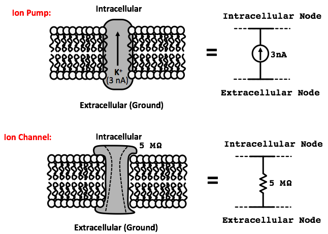 An ion pump forces charged particles to move, generating a current, so it can be modeled as a current source. An ion channel passively lets charged molecules flow through it, and can be modeled as a resistor: