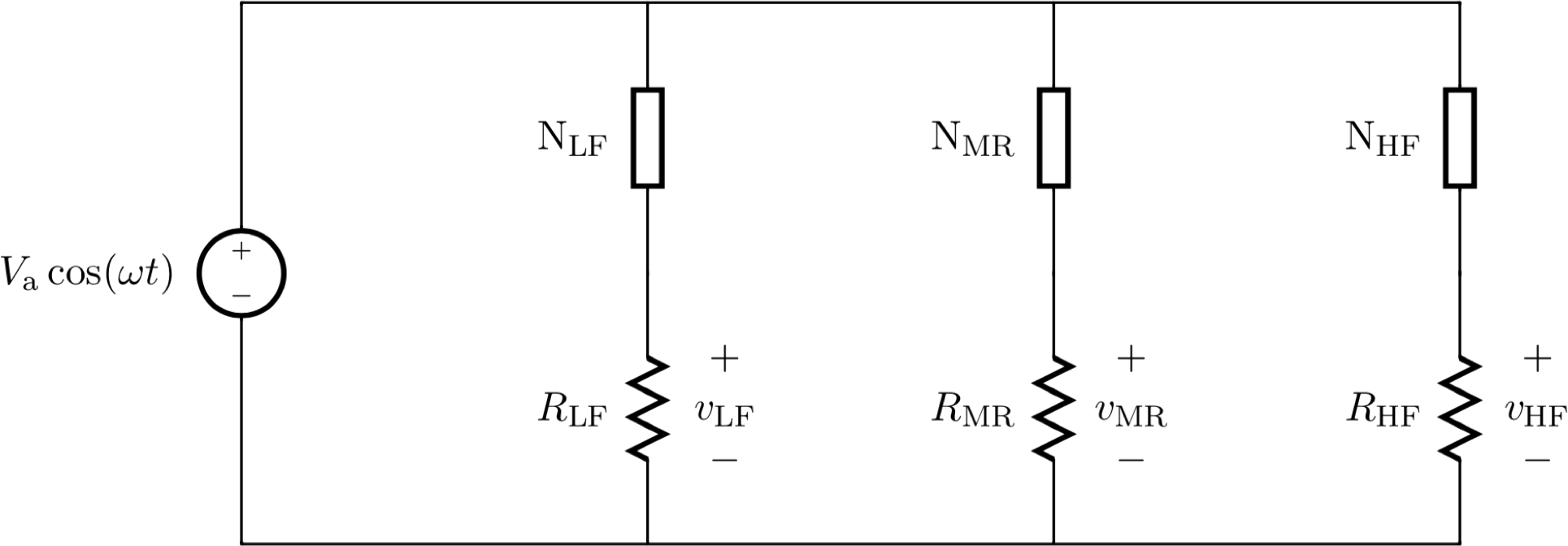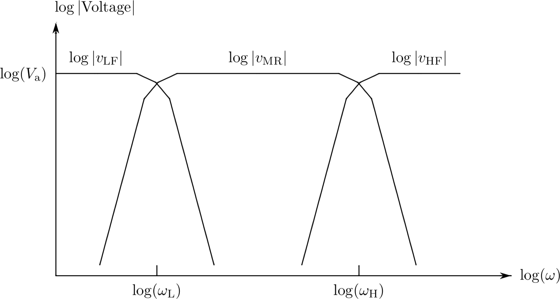 Note that \omega_L and \omega_H are the frequencies at which |v_{LF}|, |v_{MR}| and |v_{HF}| approximately fall to the value of V_a/\sqrt{2}. In this problem, we'll assume that \omega_L << \omega_H.
